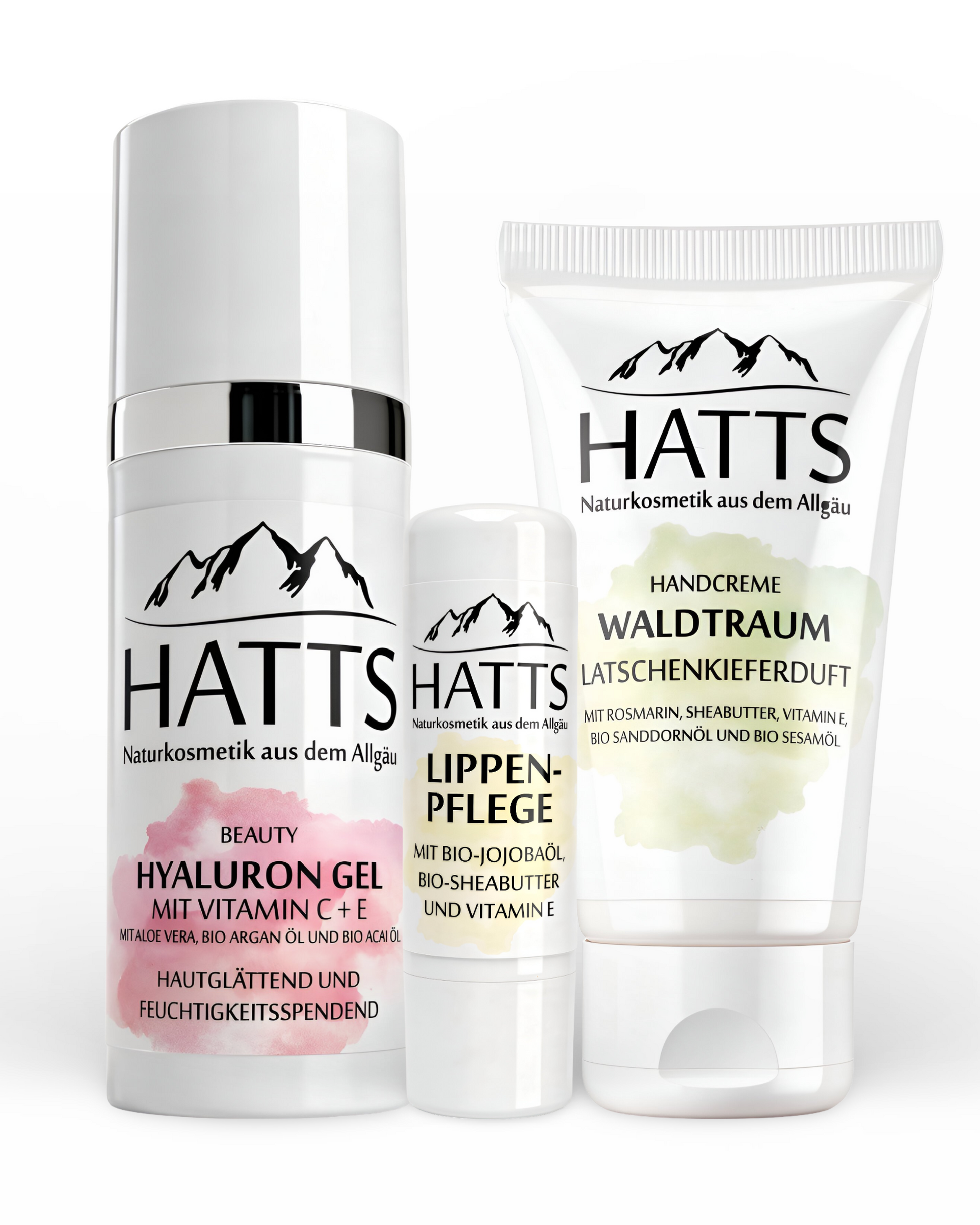 Dieses Set vereint unser Hyaluron Gel mit Vitamin C + E, die reichhaltige Handcreme Waldtraum und den Lippenpflegestift mit Bio-Ölen. Drei Produkte, die Feuchtigkeit spenden, schützen und pflegen – für Haut, Hände und Lippen.